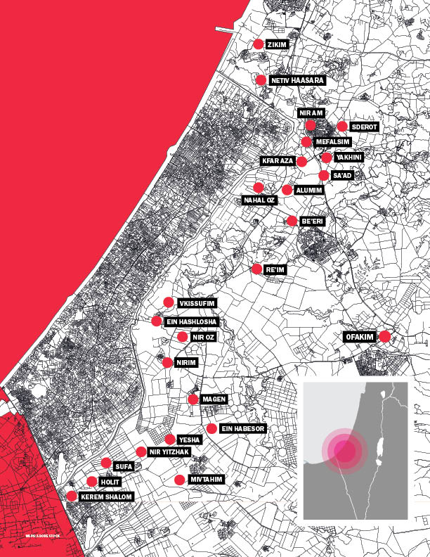 The kibbutzim, moshavim (villages), and cities Hamas attacked on October 7, 2023