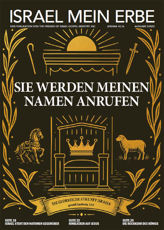Israel Mein Erbe Kostenlose Downloads der deutschen Ausgabe von Israel My Glory. (Free downloads of the German edition of Israel My Glory.) SEP/OKT 2025Sie Werden Meinen Namen Anrufen SEP/OKT 2024Der Heilige Bund der Ehe JUL/AUG 2024Gog und Magog MAI/JUN 2024Moderne Israel 101 MÄR/APR 2024Wer Kann Das Wissen? JAN/FEB 2024Ein Mann Nach Dem Herzen Gottes NOV/DEZ 2023Unser Heiliger Gott SEP/OKT 2023Versiegelt! JUL/AUG 2023Der Leitfaden Für die Verfasser des Neuen Testaments MAI/JUN 2023Auf dem Weg nach Zion MÄR/APR 2023Für einen Zeitpunkt wie diesen JAN/FEB 2023Da ist Ein Volk NOV/DEZ 2022Wie Gut Kennen Sie Ihren Jesus? SEP/OKT 2022Salomo der König JUL/AUG 2022Die Frau Das Kind Und Der Drache MAI/JUN 2022Israel Macht Den Unterschied! MÄR/APR 2022Der Jüdische Neue Bund JAN/FEB 2022Wie Liest Man Die Bibel NOV/DEZ 2021Das Verbotene Kapitel SEP/OKT 2021Die Sieben Biblischen Feste JUL/AUG 2021Wenn Wir Leiden MAI/JUN 2021Die Kraft des Evangeliums MÄR/APR 2021Wie Sollen Wir Dann Leben? JAN/FEB 2021Das Alpha Und Das Omega SEP/OKT 2020Prediger: Leben Unter der Sonne JUL/AUG 2020Jesus Kommt Wieder! Aber Wann? MAI/JUN 2020Kann Israel Überleben? MÄR/APR 2020Der Wundertäter, Der Prophet Elisa JAN/FEB 2020Zerstreut! Das Leben in der jüdischen Diaspora NOV/DEZ 2019Der Himmel Und Wie Wir Dorthin Kommen SEP/OKT 2019Hier Stehen Wir JUL/AUG 2019Elia der Prophet MAI/JUN 2019Ein Stück Leben in Israel MÄR/APR 2019Er ist Auferstanden! JAN/FEB 2019Der letzte der Richter NOV/DEZ 2018Als Gott Mensch Wurde SEP/OKT 2018Der Grosse Betrüger JUL/AUG 2018Der Lange Weg Nach Haus MAI/JUN 2018Die Soziale Medien und Israel MÄR/APR 2018Die Hohe Kunst des Umdefinierens JAN/FEB 2018Was Ist Bloß Mit Der Entrückung Passiert? NOV/DEZ 2017In der Linie des Königs SEP/OKT 2017Die Nächste Generation JUL/AUG 2017Aus Ägypten Befreit MAI/JUN 201750 Jahre MÄR/APR 2017Dein Reich Komme JAN/FEB 2017Vom Versagen Zum Vorbildhaften Glauben NOV/DEZ 2016Name Über Alle Namen SEP/OKT 2016Das Buch Micha JUL/AUG 2016Prophet, Priester, König MAI/JUN 2016Die Vergangenheit Israels MÄR/APR 2016Die Schoah damals und heute JAN/FEB 2016Ein Plädoyer für Israel: Römer 9-11 NOV/DEZ 2015Zur Rechten Zeit SEP/OKT 2015Wallfahrtslieder JUL/AUG 2015Willkommen in Samaria MAI/JUN 2015Das Leben Abrahams MÄR/APR 2015Das Buch Obadja JAN/FEB 2015Jerusalem aus Gold